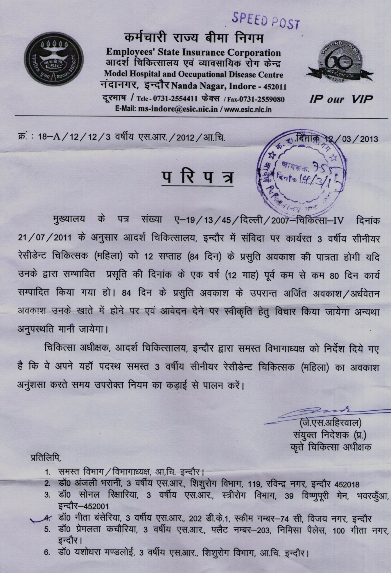 RE: ML of senior resident at ESI corp. Hospital Indore